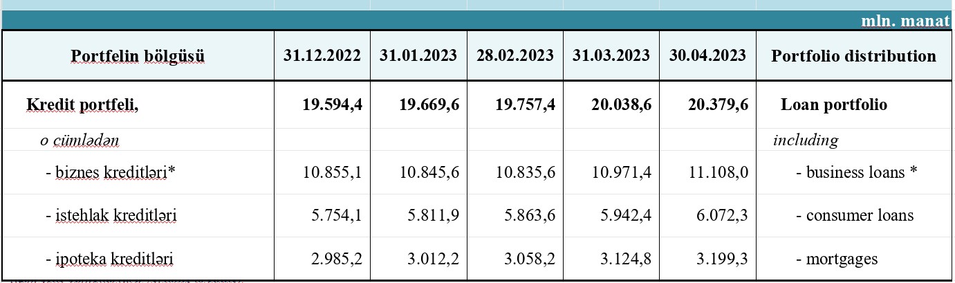 2023-cü ilin ilk 4 ayında (yanvar-aprel) biznes kreditləri 252 milyon manat, istehlak kreditləri 318 milyon manat, ipoteka kreditləri isə 214 milyon manat artıb. İlk 4 ayda cəmi kredilər 785 milyon manat artıb.