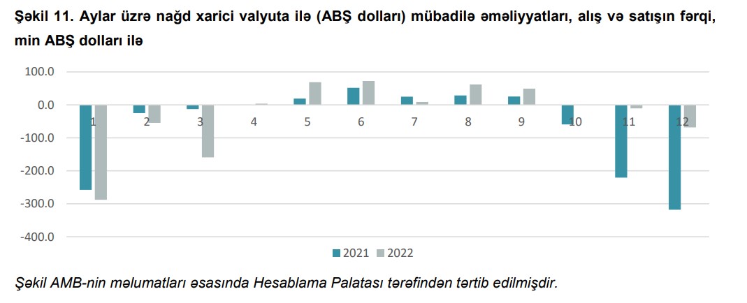Rəydə deyilir: "Nağd xarici valyuta ilə mübadilə əməliyyatlarına dair məlumatların təhlil göstərir ki, valyuta bazarında tələb azalmış və 2022-ci ilin 2-ci rübündən etibarən ABŞ dollarının banklar tərəfindən alışı satışını üstələmiş, bu tendensiya 4-cü rübədək davam etmişdir. Hesabat ilinin aprel-avqust ayları ərzində alış və satış arasında fərqin ən yüksək məbləği iyun ayında qeydə alınmış, müvafiq valyuta üzrə alış satışdan 72,3 min ABŞ dolları çox olmuşdur. İlin yekunlarına görə, nağd mübadilə əməliyyatları zamanı satış alışı üstələsə də, bu fərq 2021-ci illə müqayisədə 2,3 dəfə azalmışdır. Tədiyə balansı barədə məlumatların təhlili valyuta bazarında xarici valyuta təklifinin artmasının enerji xammallarının qiymətlərinin artması nəticəsində mal ixracının, həmçinin ölkəyə göndərilmiş pul baratlarının müsbət dinamikası ilə əlaqəli olduğunu deməyə imkan verir. Məlumatlara əsasən, 2022-ci ildə ölkəyə göndərilən pul baratları 3,6 milyard ABŞ dolları olmuşdur ki, bu da əvvəlki ilə nisbətən 3,2 dəfə çoxdur".