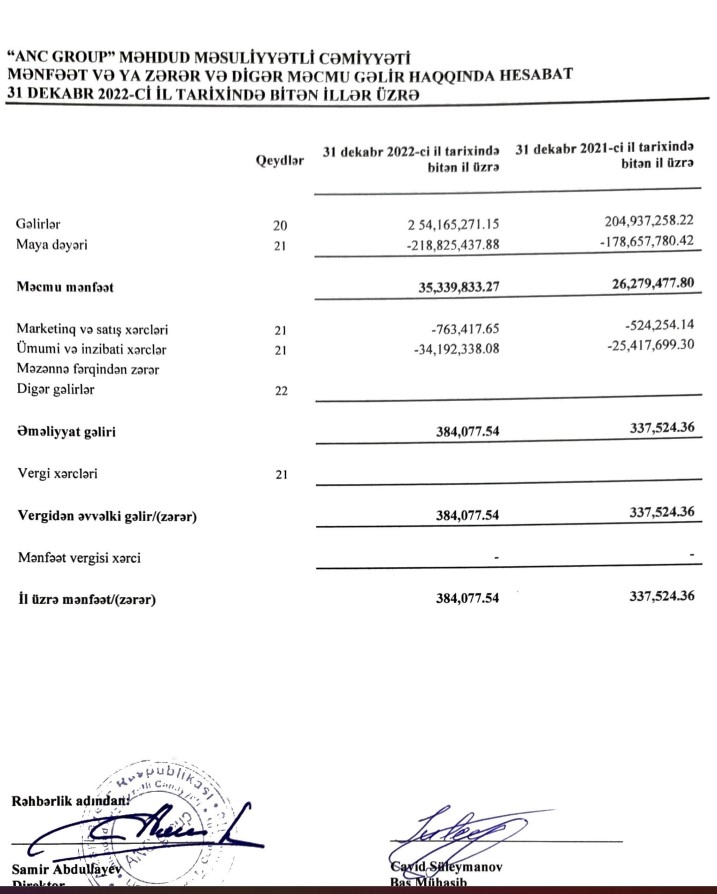 Marja.az şirkətin İnternet səhifəsində yerləşdirilmiş maliyyə hesabatlarına istinadən xəbər verir ki, "ANC GROUP"un gəlirləri 2021-ci ildə 204 milyon 937 min manat ikən, 2022-ci ildə 254 milyon 165 min manata yüksəlib (49 milyon 228 min manat və ya 24% artıb).