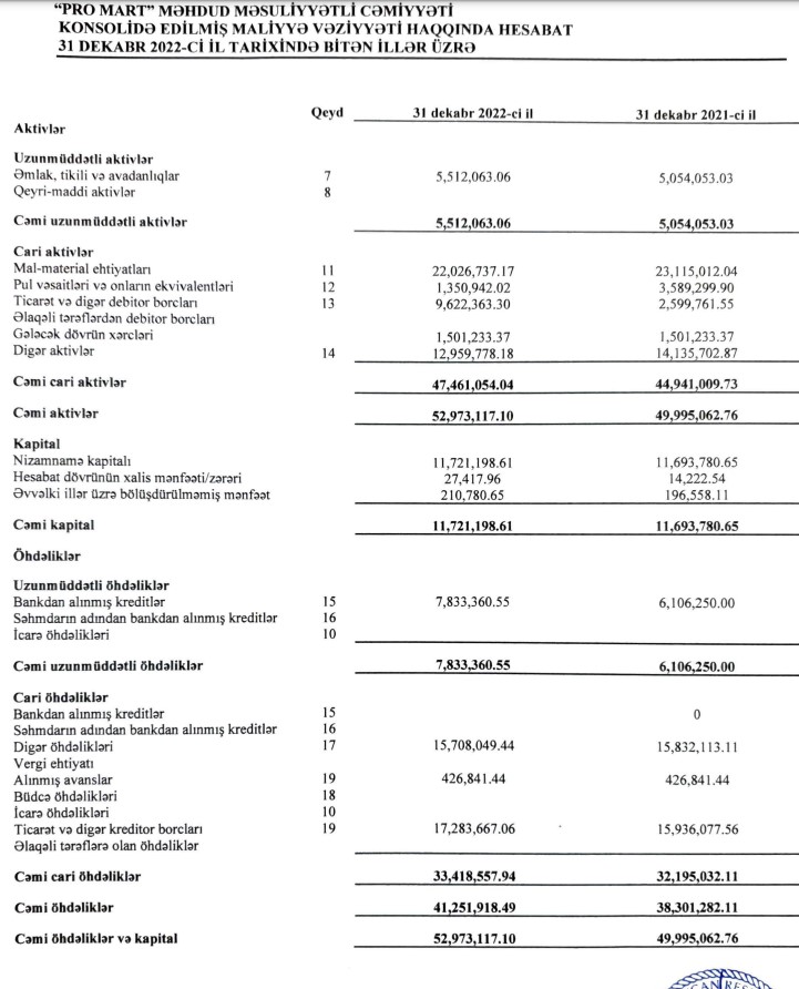 31 dekabr 2022-ci il tarixində "Pro - Mart" MMC 52 milyon 973 min manat cəmi aktivlərə malik olub. Şirkət 2021-ci ilin sonunda 49 milyon 995 min manat cəmi aktivlərə malik idi.
