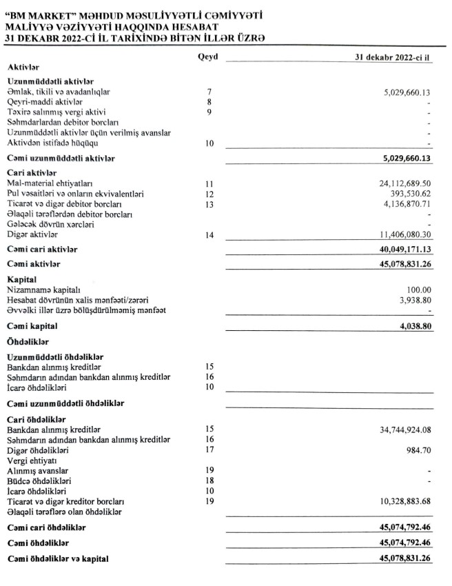31 dekabr 2022-ci il tarixində "BM- Market" MMC 45 milyon 79 min manat cəmi aktivlərə malik olub.