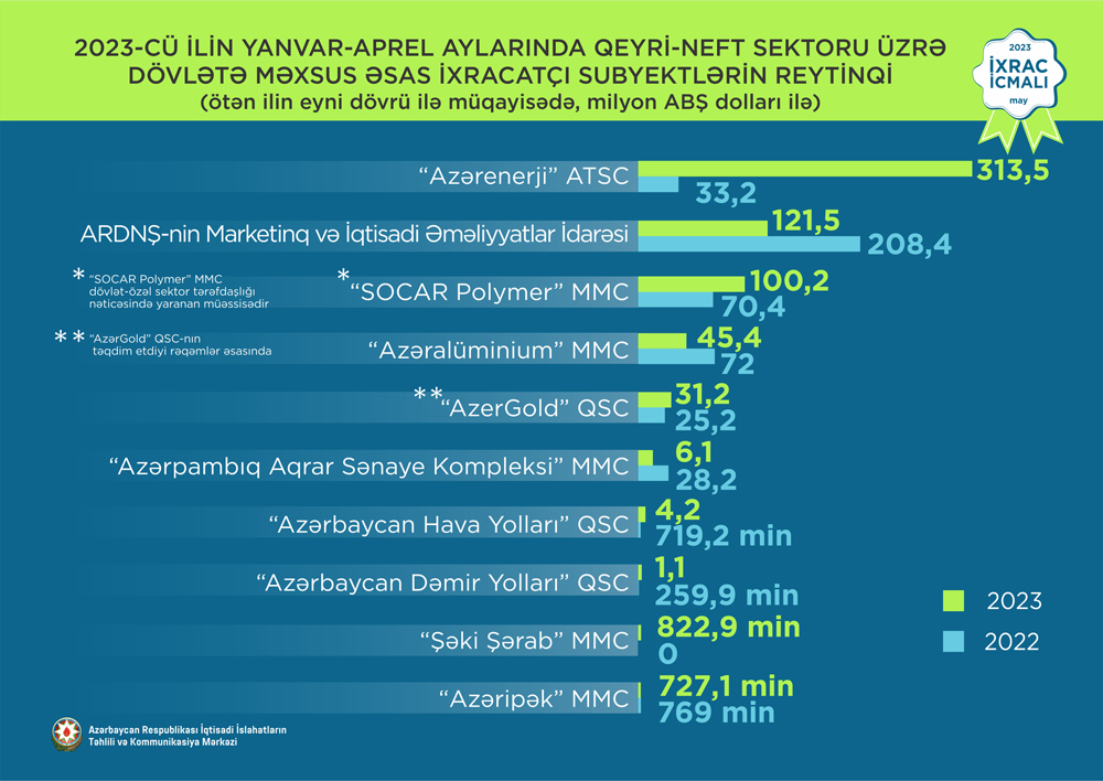 2023-cü ilin yanvar-aprel ayları üzrə hazırlanmış qeyri-dövlət ixracatçı subyektlərin reytinqində ilk onluqda aşağıdakı şirkətlər təmsil olunurlar: “MKT İstehsalat Kommersiya” MMC, “Azərbaycan İnterneyşnl Mayninq Kompani Limited” şirkətinin Azərbaycan Respublikasındakı Nümayəndəliyi, “Baku Steel Company” QSC, “STP Global Cable” MMC, “P-Aqro” MMC, “Azərbaycan Şəkər İstehsalat Birliyi” MMC, Şirinov Elvin Valeh oğlu, “Mors Trading” MMC, “Best Logistik” MMC, “Khan-El” MMC.