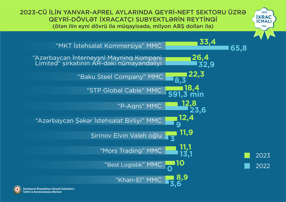 Marja.az İqtisadi İslahatların Təhlili və Kommunikasiya Mərkəzinin (İİTKM) “İxrac icmalı”nın may sayına istinadən xəbər verir ki, 2023-cü ilin yanvar-aprel aylarında “Baku Steel Company”nin ixracının dəyəri 22,3 milyon dollar təşkil edib. Ötən ilin eyni dövründə şirkətin ixracı 8,3 milyon dollar olmuşdu. Beləliklə, bu il “Baku Steel Company”nin ixracı 2,7 dəfə artıb.