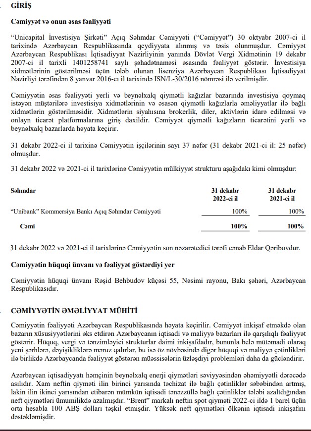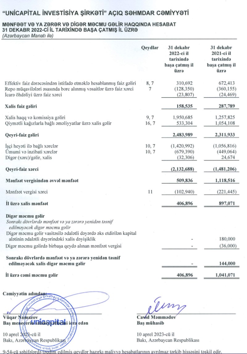 “Unicapital İnvestisiya Şirkəti” ASC 2022-ci ili 407 min manat xalis mənfəət ilə başa vurub. Şirkət 2021-ci ili 897 min manat xalis mənfəət ilə bağlamışdı.