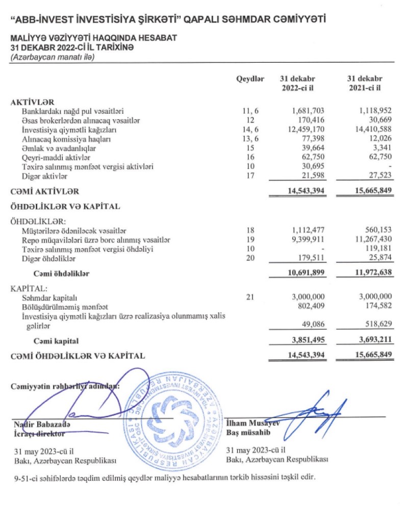 2022-ci il sonuna Şirkət 14 milyon manat məbləğində aktivlərə malik olub.