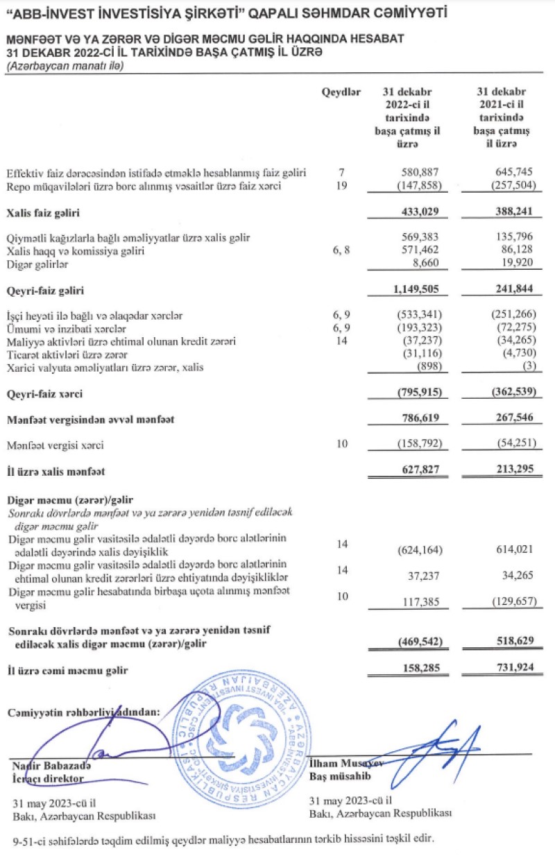 Müvafiq beynəlxalq standartlara uyğun hazırlanmış maliyyə hesabatlarına əsasən, “ABB İnvest İnvestisiya Şirkəti” QSC-nin 2022-ci il üzrə xalis mənfəəti 2021-ci ilə nisbətən 194% (təxminən 3 dəfə) artaraq 627 min 827 manat təşkil edib. Şirkət 2021-ci ili 213 min 295 manat xalis mənfəət ilə bağlamışdı.