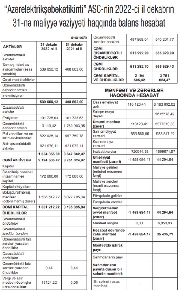 “Azərelektrikşəbəkətikinti” ASC-nin 2022-ci ili 1 milyon 459 min manat xalis zərər ilə başa vurub. Şirkət 2021-ci ili 35 min 436 manat xalis mənfəət ilə bağlamışdı. Zərər gəlirlərin azalması ilə əlaqədardır.