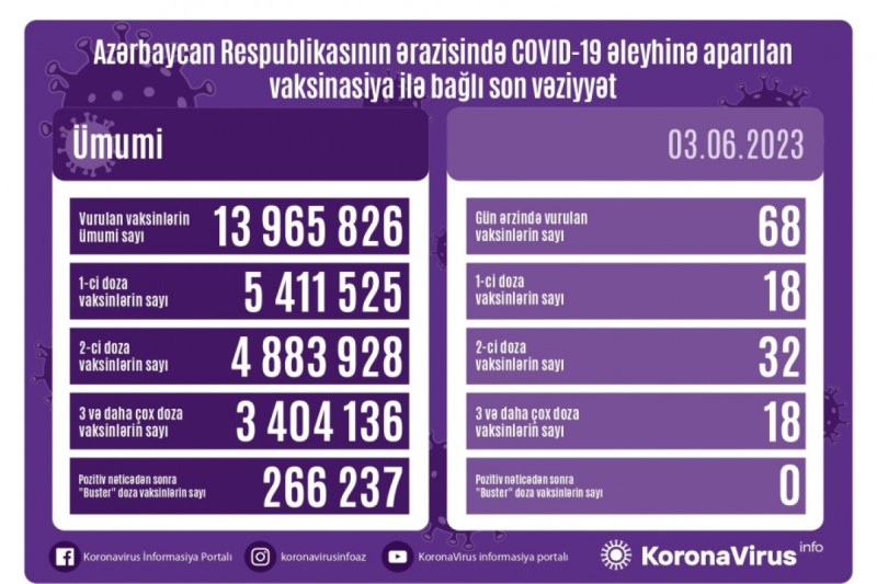 Azərbaycanda son sutkada koronavirus (COVID-19) əleyhinə 68 vaksin vurulub. Bir gündə birinci mərhələ üzrə vaksinasiya olunanların sayı 18, ikinci mərhələ üzrə vaksinasiya olunanların sayı 32, üç və daha çox doza üzrə vaksinasiya olunanların sayı 18-dir. Pozitiv nəticədən sonra buster doza üzrə vaksin vurulmayıb.