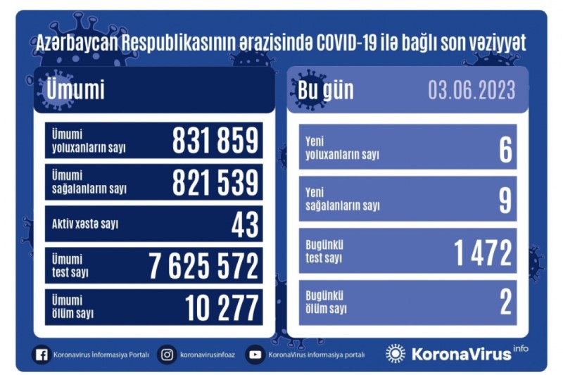 Azərbaycan Respublikasında koronavirus (COVID-19) infeksiyasına 6 yeni yoluxma faktı qeydə alınıb, 9 nəfər müalicə olunaraq sağalıb.