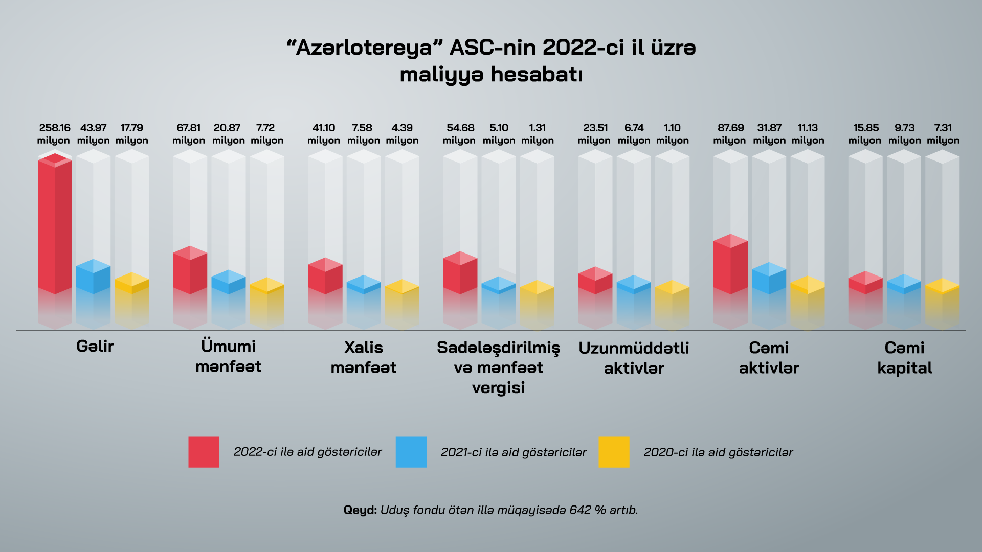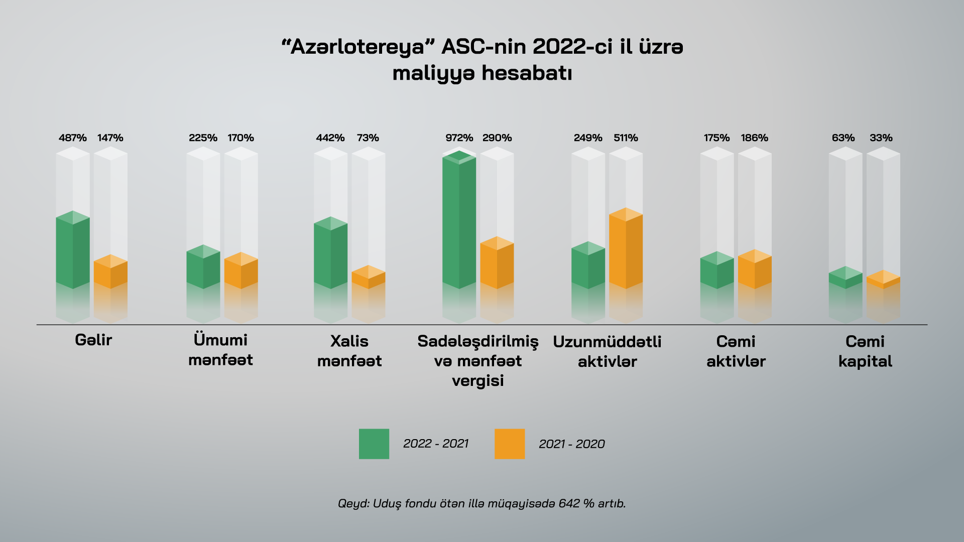 Press-relizdə bildirilir ki, 2022-ci ildə “Azərlotereya” ASC-nin satışdan gəlirləri ötən ilə nisbətən 487 faiz artaraq 258,2 milyon manat təşkil edib. Lotereya iştirakçıları üçün ayrılmış uduş fondunda da xeyli artım müşahidə olunub. Bu göstərici 2021-ci illə müqayisədə 642 faiz artıb.