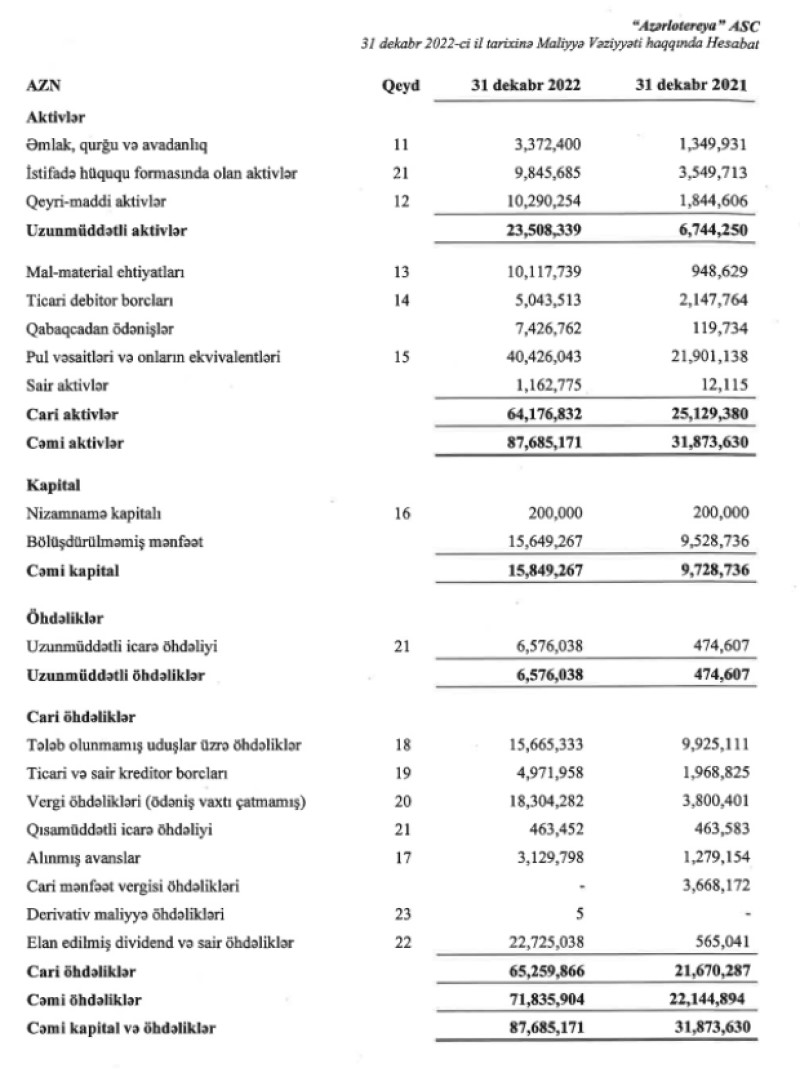 “Azərlotereya” 2022-ci ildə 1 milyon 187 min manat maliyyə gəlirləri də əldə edib (2021-ci ildə 505 min manat).