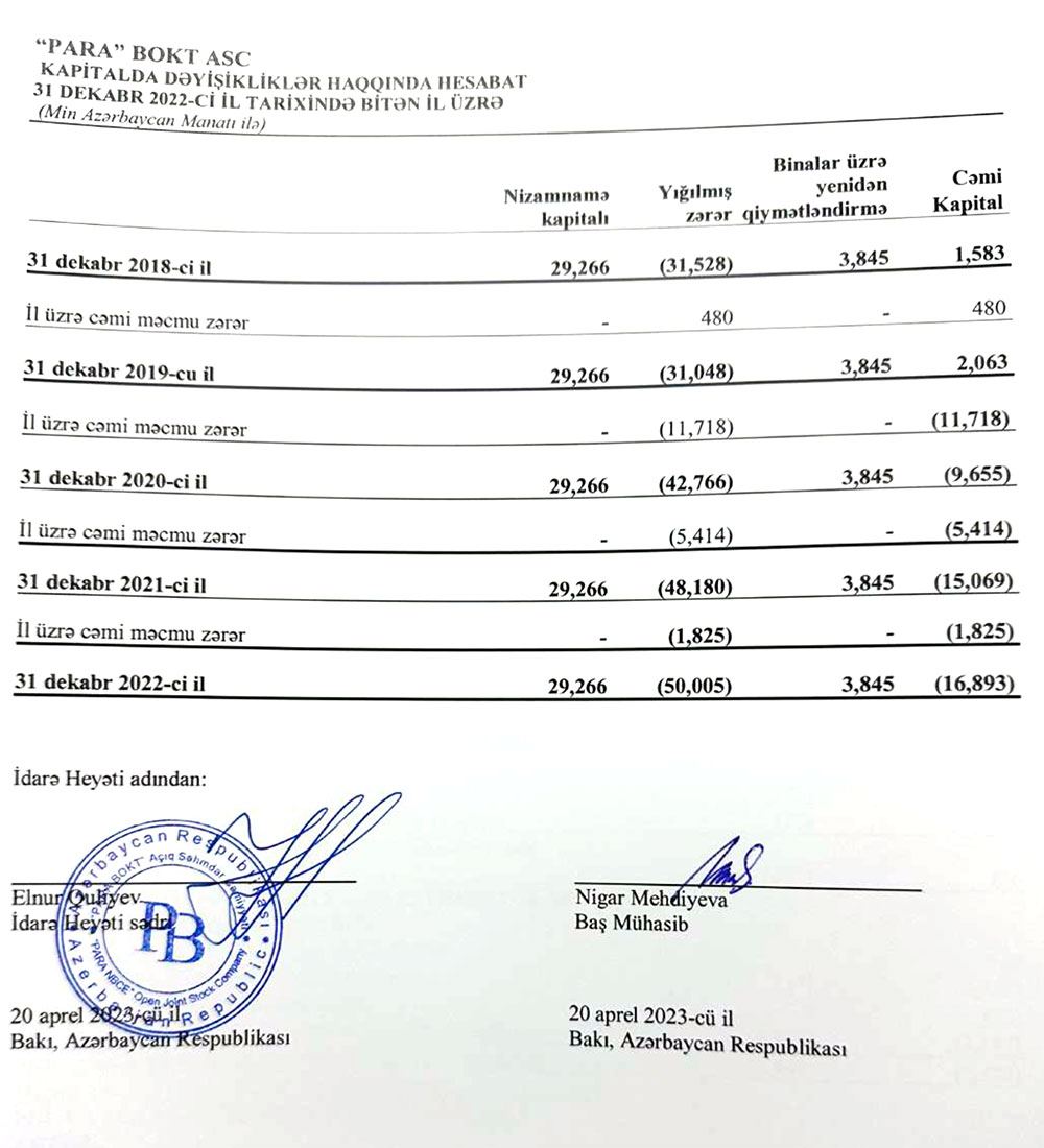 "Para Bank Olmayan Kredit Təşkilatı" ASC 31 dekabr 2022-ci il tarixində bitən il üzrə maliyyə hesabatını dərc edib.
