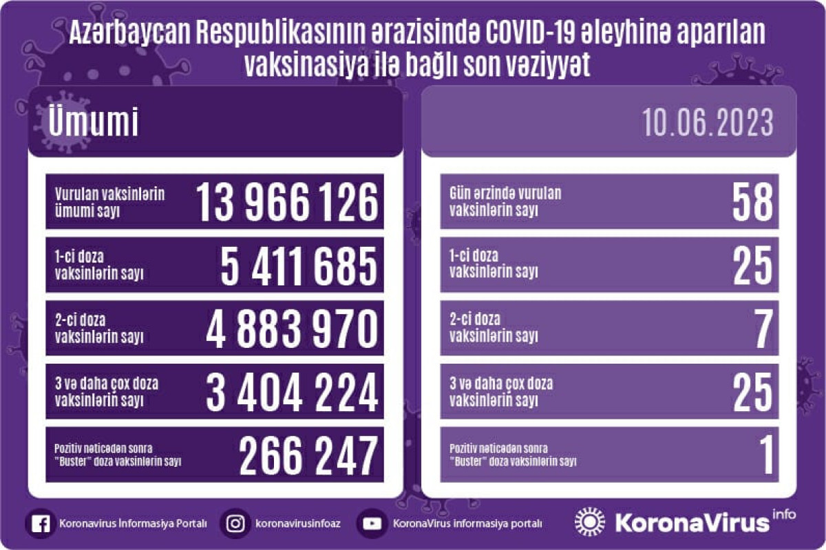Azərbaycanda son sutkada koronavirus (COVID-19) əleyhinə 58 vaksin vurulub. Bir gündə birinci mərhələ üzrə vaksinasiya olunanların sayı 25, ikinci mərhələ üzrə vaksinasiya olunanların sayı 7, üç və daha çox doza üzrə vaksinasiya olunanların sayı 25, pozitiv nəticədən sonra buster doza üzrə vaksinasiya olunanların sayı 1 nəfərdir.