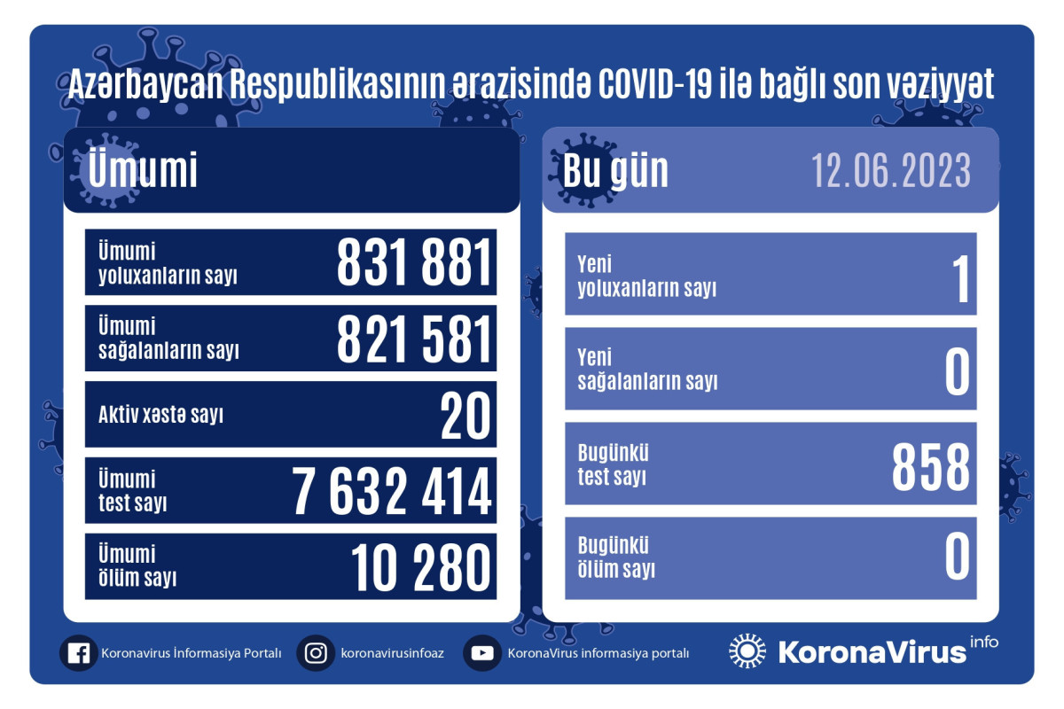 Azərbaycan Respublikasında koronavirus (COVID-19) infeksiyasına 1 yeni yoluxma faktı qeydə alınıb, müalicə olunaraq sağalan olmayıb.
