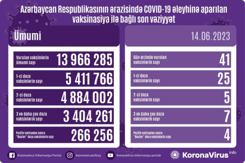 Azərbaycanda son sutkada koronavirus (COVID-19) əleyhinə 41 vaksin vurulub. Bir gündə birinci mərhələ üzrə vaksinasiya olunanların sayı 25, ikinci mərhələ üzrə vaksinasiya olunanların sayı 5, üç və daha çox doza vaksin vurduranların sayı 7, pozitiv nəticədən sonra buster doza üzrə vaksinasiya olunanların sayı isə 4 nəfərdir.