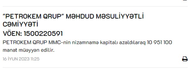 17:27 -"Petrokem Qrup" şirkətindən Marja-ya daxil olan məlumatda bildirilir ki, "Vergilər" qəzetində dərc edilmiş elanda texniki səhvə yol verilib. Belə ki, "Petrokem Qrup" şirkətinin deyil, onun törəmə şirkəti olan "Petrochem Performance Products" MMC şirkətinin nizamanmə kapitalı azaldılır.