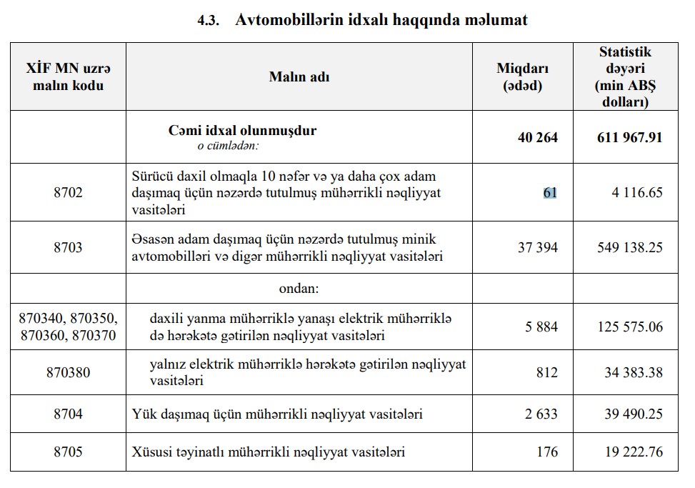2023-cü ilin ilk 5 ayı ərzində (yanvar-may) Azərbaycana 611 milyon 968 min dollar dəyərində 40 min 264 ədəd avtomobil (nəqliyyat vasitələri) idxal edilib.