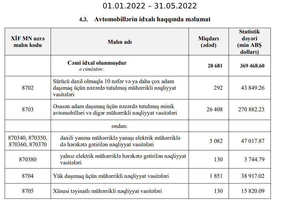 Müqayisə üçün qeyd edək ki, 2022-ci ilin ilk 5 ayı ərzində (yanvar-may) Azərbaycana 369 milyon 469 min dollar dəyərində 28 min 681 ədəd avtomobil, o cümlədən 270 miylon 882 min dollar dəyərində 26 min 408 ədədə minik avtomobili idxal edilmişdi.
