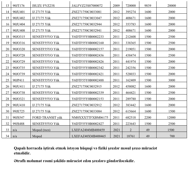 Nəqliyyat vasitələri haqqında ətraflı məlumat və başlanğıc qiyməti aşağıda göstərilib: