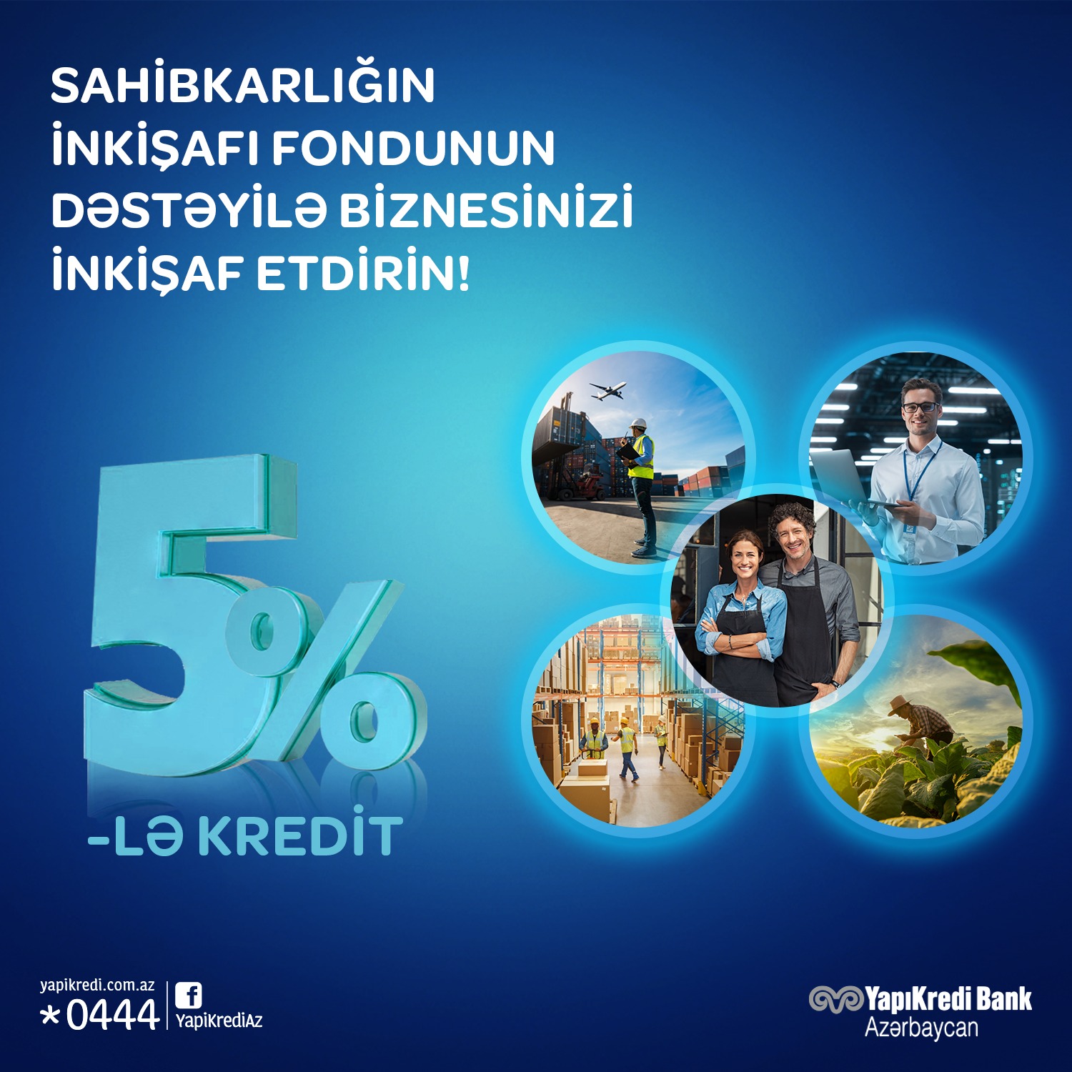 “Yapı Kredi Bank Azərbaycan” QSC-nin dəstəyilə biznesinizi inkişaf etdirin(®) Hər zaman ölkəmizdə sahibkarlığın inkişafına dəstək olan Yapı Kredi Sahibkarlığın İnkişafı Fondu ilə əməkdaşlıq çərçivəsində güzəştli şərtlərlə cəmi 5%-lə kreditlər təklif edir.