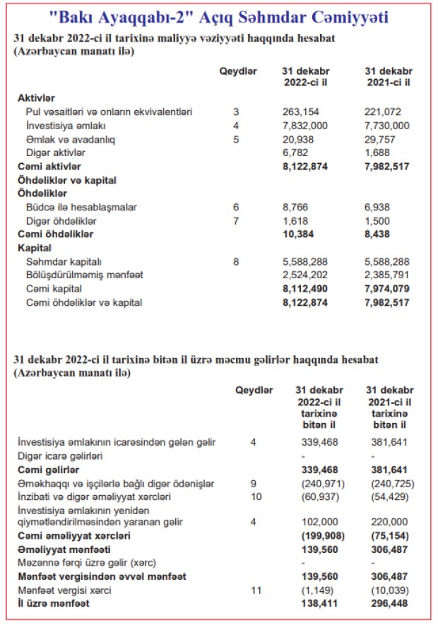 “Bakı Ayaqqabı 2” ASC 2022-ci ili 138 min 411 manat xalis mənfəət ilə başa vurub. Şirkət 2021-ci ili 296 min 448 manat xalis mənfəət ilə bağlamışdı.