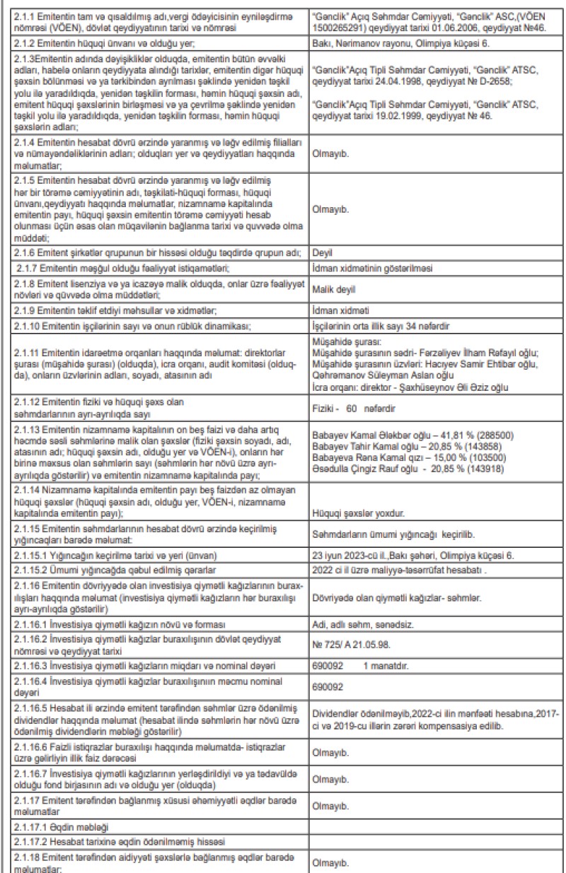 "Gənclik" ASC-nin səhmdarları Babayev Kamal Ələkbər oğlu (41,81%), Babayev Tahir Kamal oğlu (20,85%), Babayeva Rəna Kamal qızı (15%), Əsədulla Çingiz Rauf oğludur (20,85%).