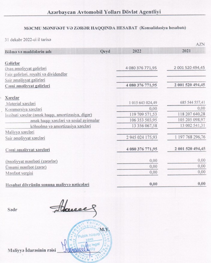 Azərbaycan Avtomobil Yolları Dövlət Agentliyi 2022-ci ildə nə mənfəət əldə edib, nə də zərər edib. Agentlik 2022-ci ildən də qalıqsız çıxıb.