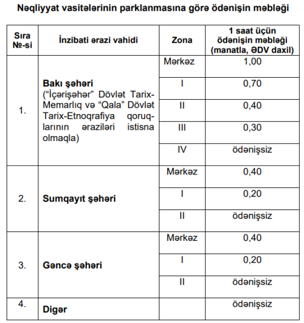 Qərara görə, Bakı şəhərinin mərkəzində (“İçərişəhər” Dövlət TarixMemarlıq və “Qala” Dövlət Tarix-Etnoqrafiya qoruqlarının əraziləri istisna olmaqla) 1 saat üçün ödənişin məbləği 1 manat, 1-ci zona üçün 70 qəpik, 2-ci zona üçün 40 qəpik, 3-cü zona üçün 30 qəpik təsdiq edilib, 4-cü zonada isə parklanma ödənişsizdir.