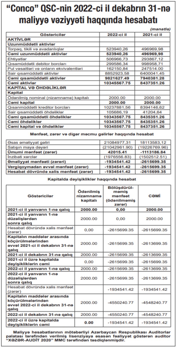 31 dekabr 2022-ci il tarixində “CONCO” QSC 10 milyon 345 min 568 manat cəmi aktivlərə malik olub. Şirkət 2021-ci ilin sonunda 8 milyon 437 min 351 manat cəmi aktivlərə malik idi.