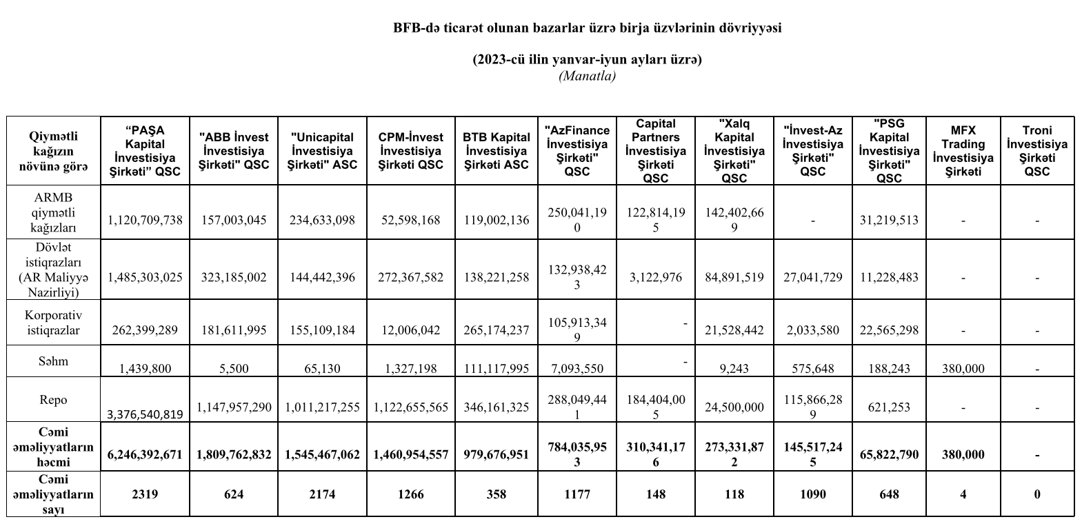 Marja Birja-ya istinadən xəbər verir ki, 2023-cü ilin yanvar-iyun ayları üzrə “PAŞA Kapital İnvestisiya Şirkəti” QSC 1-ci, "ABB İnvest İnvestisiya Şirkəti" QSC 2-ci və "Unicapital İnvestisiya Şirkəti" ASC 3-cü yeri tutublar.