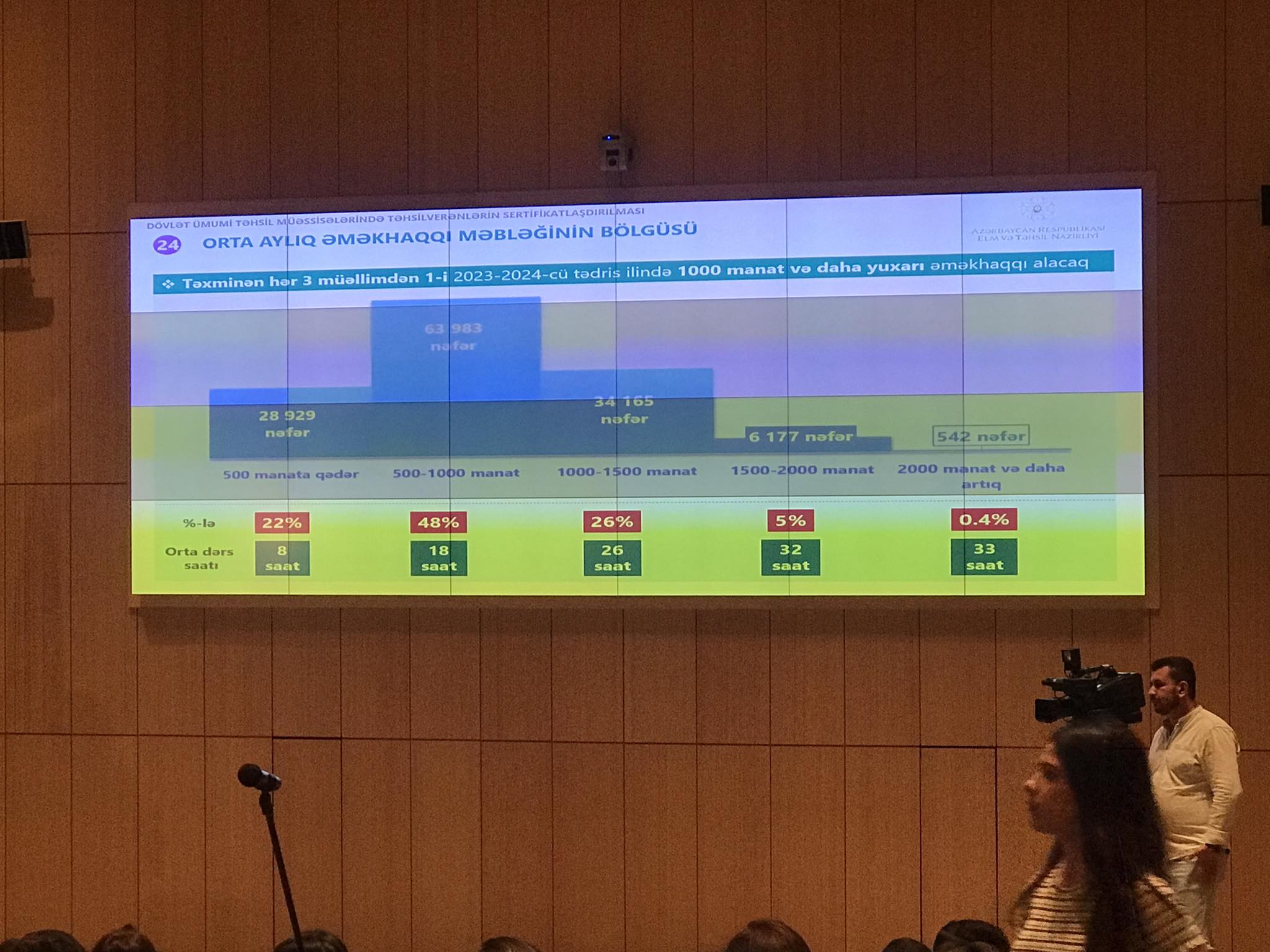 O qeyd edib ki, 28929 müəllim 500 AZN-ə qədər, 63 983 müəllim 500-1000 AZN arası, 34165 müəllim 1000-1500 AZN arası, 6177 müəllim 1500-2000 AZN, 542 nəfər isə 2000 AZN və daha artıq maaş alacaq.