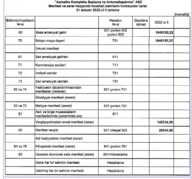 "AZMETKO Kompleks Sazlama və Avtomatlaşdırma" ASC 2022-ci ili 116 min manat xalis mənfəət ilə başa vurub. Şirkət 2021-ci il üzrə mənfəət və balans hesabatını dərc etməmişdir. AZMETKO 2020-ci ili də 116 min manat xalis mənfəət ilə bağlamışdı.
