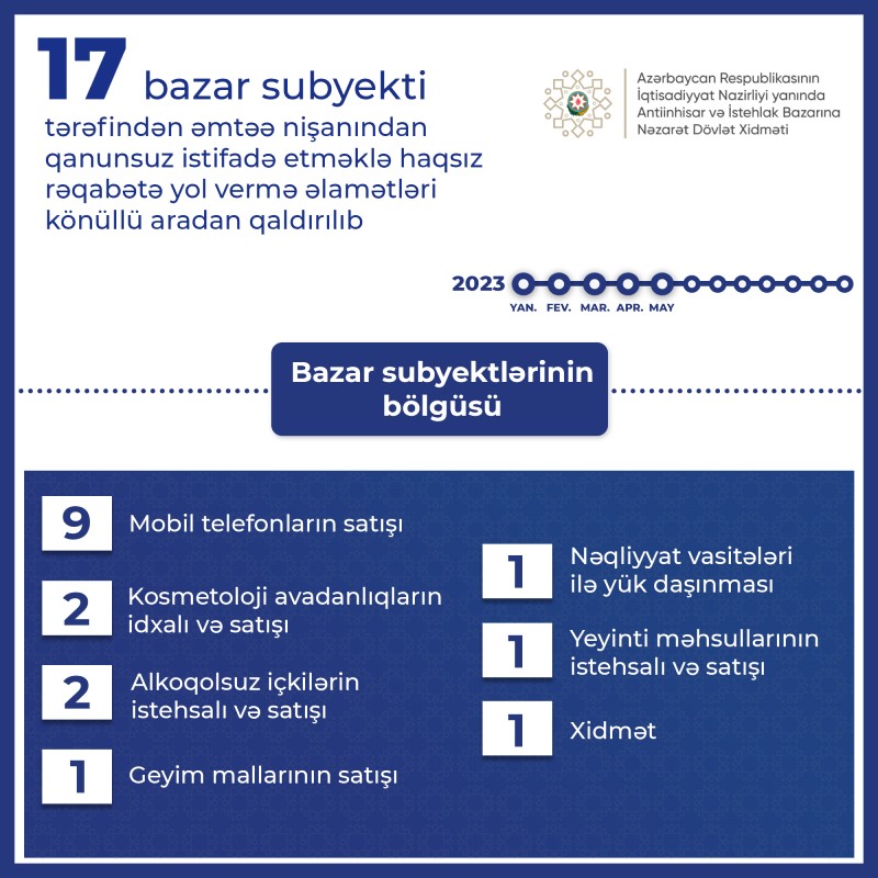2023-cü ilin yanvar-may aylarında 17 bazar subyekti tərəfindən əmtəə nişanından qanunsuz istifadə etməklə haqsız rəqabətə yol vermə əlamətləri könüllü aradan qaldırılıb.