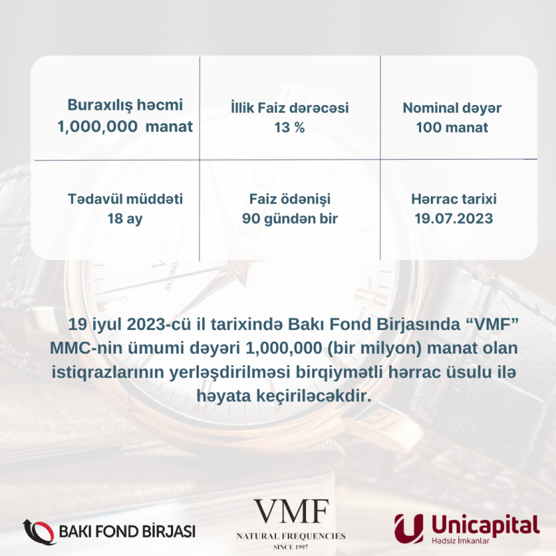 19 iyul 2023-cü il tarixində Bakı Fond Birjasında “VMF” MMC-nin ümumi dəyəri 1 milyon manat olan istiqrazlarının yerləşdirilməsi birqiymətli hərrac üsulu ilə həyata keçiriləcəkdir.