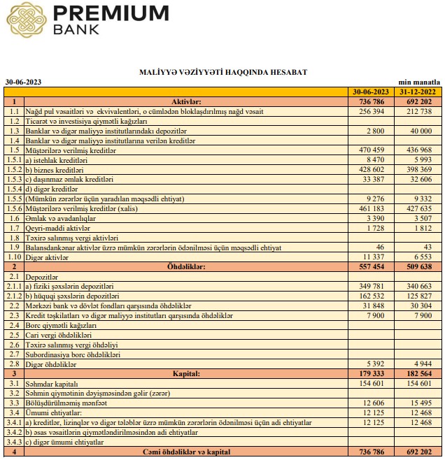 "Premium Bank"ın kredit portfeli (müştərilərə verilmiş kreditlər) 2023-cü ilin ilk 6 ayında (yanvar-iyun) ötən ilin sonu ilə müqayisədə 33 milyon 491 min manat və ya 7,7% artaraq 470 milyon 459 min manata çatıb.