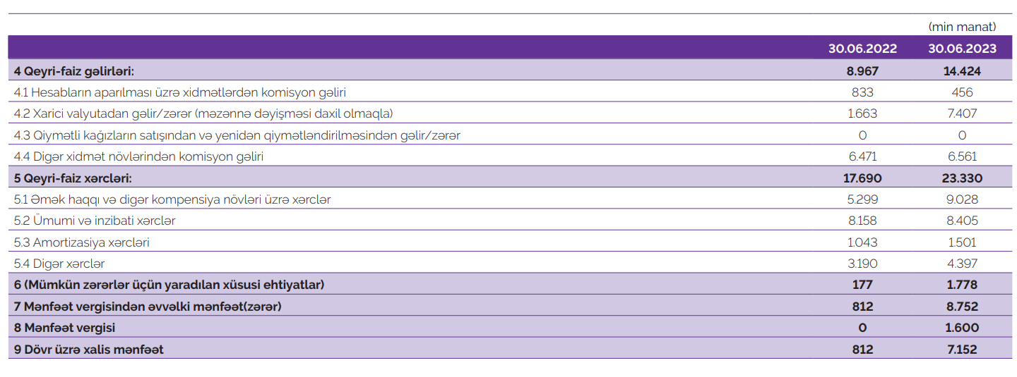 Müqayisə üçün qeyd edək ki, 2022-ci ilin ilk 6 ayında "Azər Türk Bank"ın cəmi əməliyyat gəlirləri 23 milyon 219 min manat, cəmi əməliyyat xərcləri 22 milyon 231 min manat, əməliyyat mənfəəti 988 min manat, ehtiyatlara ayırma 177 min manat təşkil etmişdi.