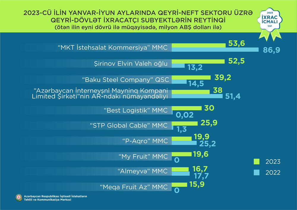 2023-cü ilin yanvar-iyun ayları üzrə hazırlanmış qeyri-dövlət ixracatçı subyektlərin reytinqində ilk onluqda aşağıdakı şirkətlər təmsil olunur: