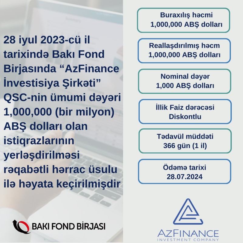 “AzFinance İnvestisiya Şirkəti” QSC-nin istiqrazlarının yerləşdirilməsi üzrə hərrac keçirilib.28 iyul 2023-cü il tarixində Bakı Fond Birjasında “AzFinance İnvestisiya Şirkəti” QSC-nin tədavül müddəti 366 gün (1 il), nominal dəyəri 1 000 ABŞ dolları olan AZ2004019710 dövlət qeydiyyat nömrəli 1 milyon ABŞ dolları həcmində olan, diskontlu, təmin edilməmiş sənədsiz, adlı istiqrazlarının yerləşdirilməsi üzrə rəqabətli hərrac yekunlaşıb.