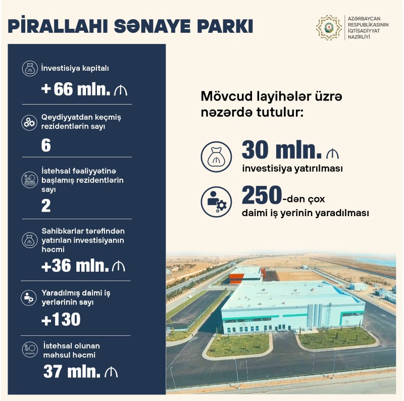 "Buraya 36 milyon manatdan çox investisiya yatırılıb, 130-dan çox daimi iş yeri yaradılıb, 37 milyon manatlıq məhsul istehsal edilib. Mövcud layihələr üzrə 30 milyon manata yaxın investisiyanın yatırılması, 250-dən artıq iş yerinin yaradılması nəzərdə tutulur".