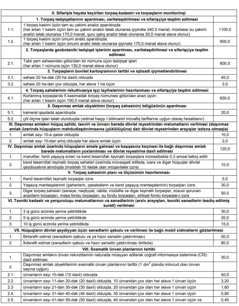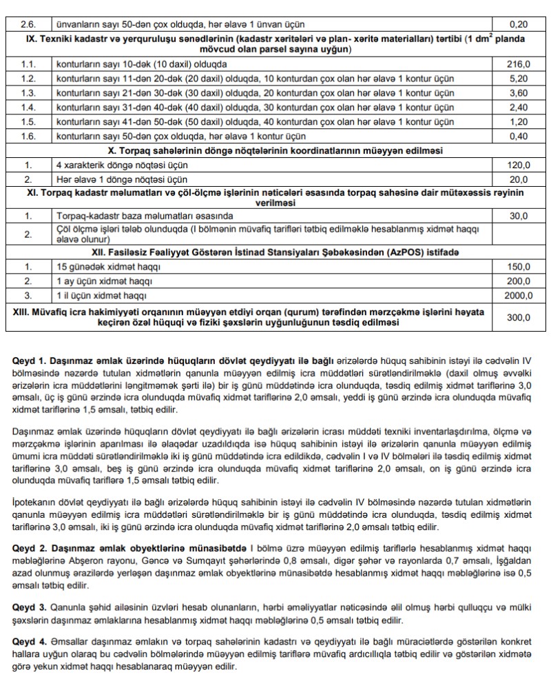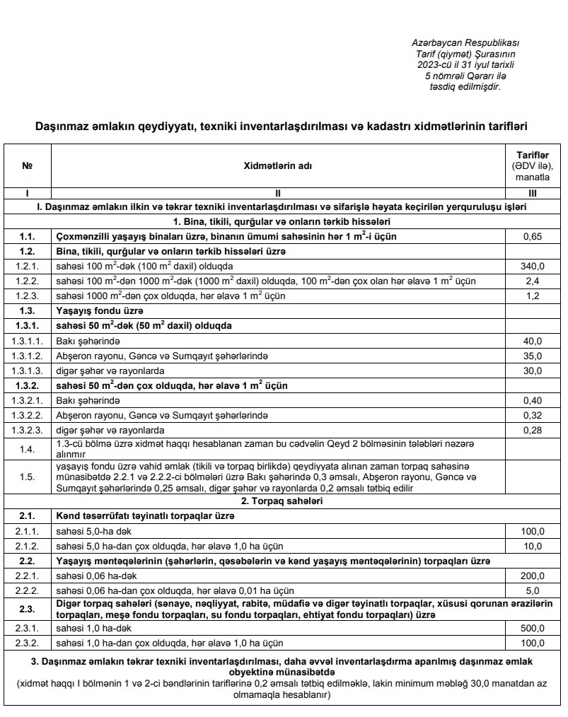 Bu barədə Tarif (Qiymət) Şurasının daşınmaz əmlakın qeydiyyatı, texniki inventarlaşdırılması və kadastrı xidmətlərinin tariflərinin tənzimlənməsi barədə qərarınnda bildirilir.