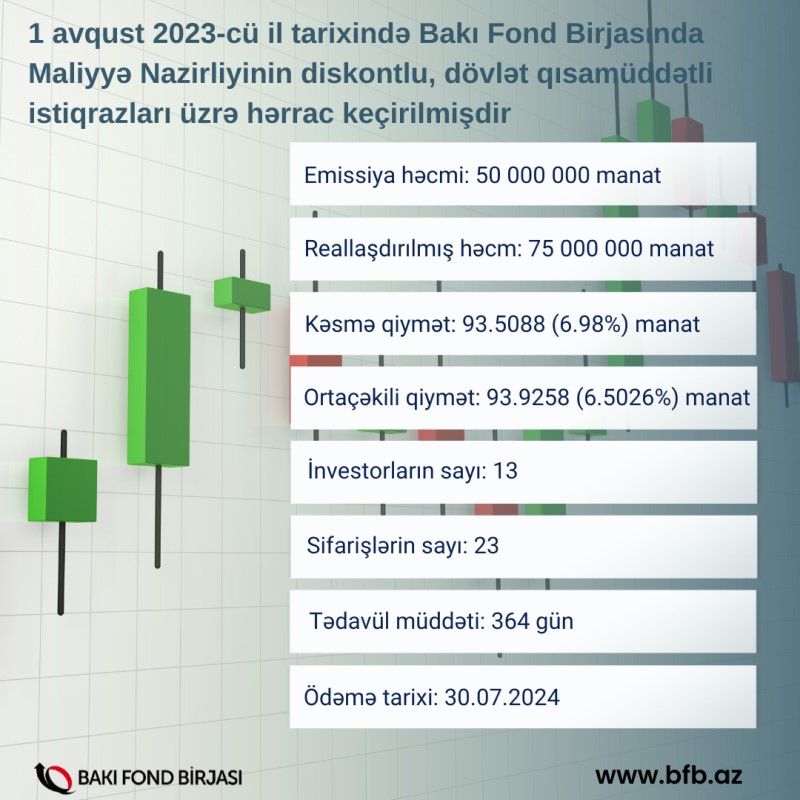 Maliyyə Nazirliyinin istiqrazlarının yerləşdirilməsi üzrə hərrac keçirilmişdir1 avqust 2023-cü il tarixində Bakı Fond Birjasında Azərbaycan Respublikasının Maliyyə Nazirliyinin AZ0101030069 ISIN-li, 50 milyon manat həcmində, 364 gün tədavül müddətli diskontlu, dövlət qısamüddətli istiqrazlarının (DQİ) yerləşdirilməsi üzrə hərrac keçirilib.