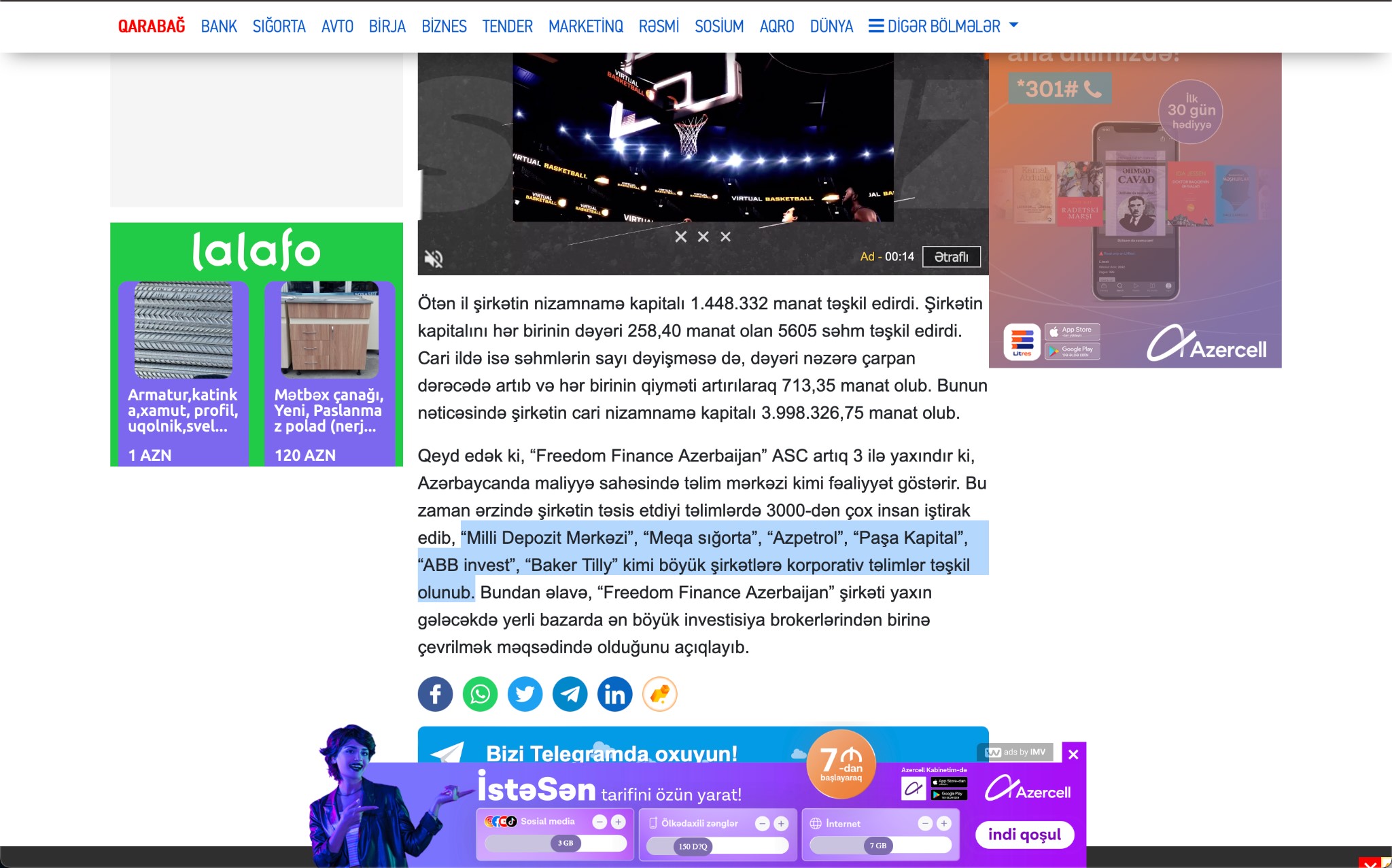 "Freedom Finance Azerbaijan" ASC-nin nizamnamə kapitalının artımı ilə bağlı xəbərində qeyd edilmişdi ki, şirkət “Milli Depozit Mərkəzi”, “Meqa sığorta”, “Azpetrol”, “Paşa Kapital”, “ABB invest”, “Baker Tilly” kimi böyük şirkətlərə korporativ təlimlər təşkil edib. "Maraqlıdır ki, bu şirkət Azərbaycanın ən köklü infrastruktur iştirakçısı olan və Mərkəzi Bankın nəzdnində olan Milli Depozit Mərkəzinə, eləcə də “Meqa sığorta”, “Paşa Kapital”, “ABB invest” kimi peşəkar iştirakçılara necə bir təlim keçib?", – jurnalist soruşur.