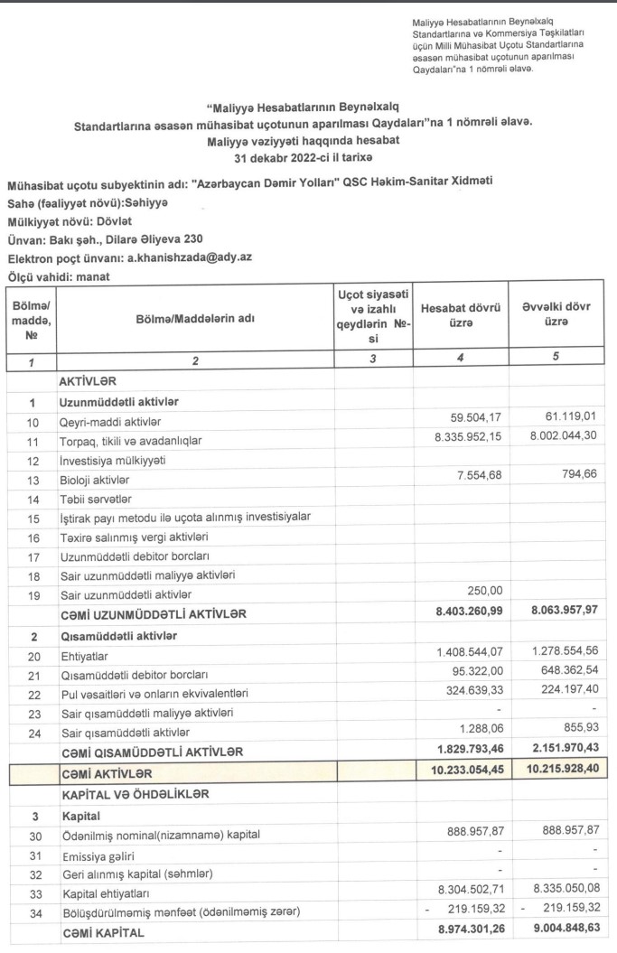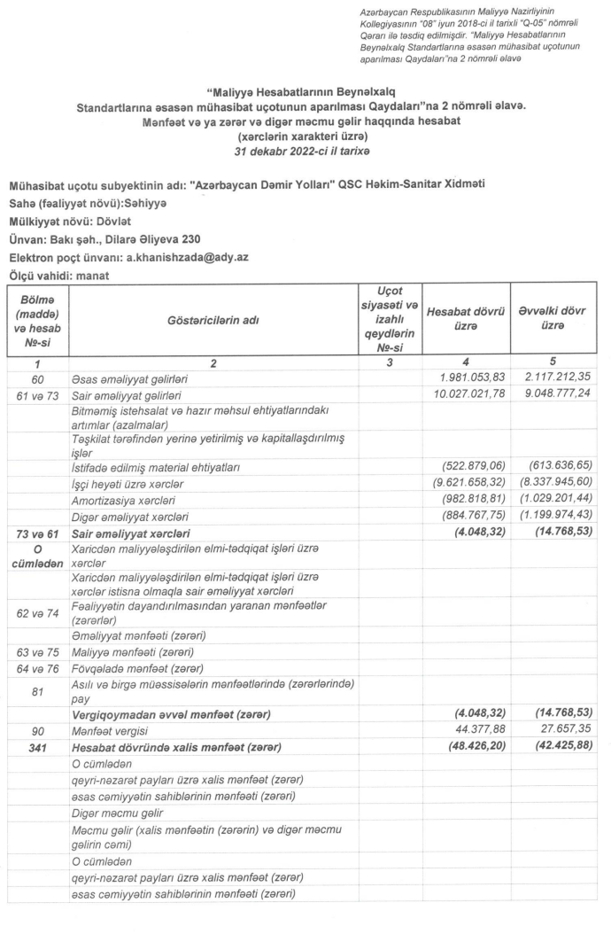 “Azərbaycan Dəmir Yolları" QSC-nin Həkim-Sanitar Xidməti 2022-ci ili 48 min manat xalis zərərlə başa vurub.