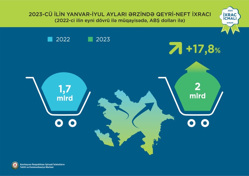 İqtisadi İslahatların Təhlili və Kommunikasiya Mərkəzinin (İİTKM) təqdim etdiyi “İxrac icmalı”nın avqust sayına əsasən, 2023-cü ilin yanvar-iyul ayları ərzində Azərbaycanın ümumi ixracı 20,8 milyard ABŞ dolları, qeyri-neft sektoru üzrə ixrac isə 2022-ci ilin müvafiq dövrü ilə müqayisədə 17,8% artaraq 2 milyard ABŞ dolları təşkil edib. 2023-cü ilin yanvar-iyul ayları ərzində yeyinti məhsulları üzrə ixrac 520 milyon ABŞ dollarına bərabər olub.