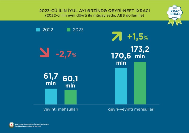2023-cü ilin iyul ayının qeyri-neft ixracı ötən ilin müvafiq dövrü ilə müqayisədə 0,4% artaraq 233,2 milyon ABŞ dolları təşkil edib. 2023-cü ilin iyul ayı ərzində yeyinti məhsulları üzrə ixrac 60,1 milyon ABŞ dollarına, qeyri-yeyinti məhsulları üzrə isə 1,5% artaraq 173,2 milyon ABŞ dollarına bərabər olub.