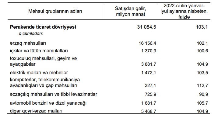 Dövlət Statistika Komitəsinin yaydığı məlumata görə, 2022-ci ilin yanvar-iyul ayları ilə müqayisədə pərakəndə ticarət dövriyyəsi real ifadədə 3,1 faiz, o cümlədən ərzaq məhsulları, içkilər və tütün məmulatları üzrə 2,0 faiz, qeyri-ərzaq malları üzrə 4,3 faiz artmışdır.