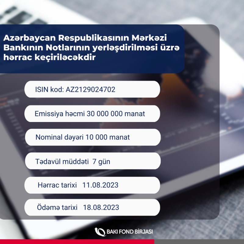 11 avqust 2023-cü il tarixlərində Bakı Fond Birjasında Azərbaycan Respublikasının Mərkəzi Bankının notlarının yerləşdirilməsi üzrə hərrac keçiriləcəkdir.