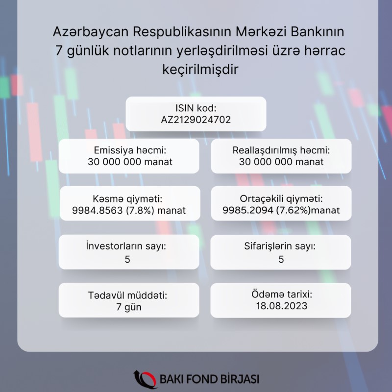 11 avqust 2023-cü il tarixində Bakı Fond Birjasında Azərbaycan Respublikasının Mərkəzi Bankının (ARMB) AZ2129024702 dövlət qeydiyyat nömrəli 30 milyon manat həcmində 7 gün tədavül müddətli notlarının yerləşdirilməsi üzrə hərrac keçirilmişdir.