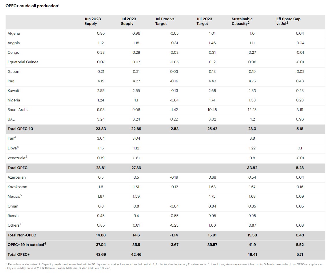 İyulda qlobal neft hasilatı gündəlik 910 min barel azalaraq 100,9 barel/gün təşkil edib. İyul ayında Səudiyyə Ərəbistanında hasilatın kəskin azalması baş verib. OPEC+ blokunda hasilat gündəlik 1,2 milyon barel azalaraq 50,7 milyon barel/günə düşüb, qeyri-OPEC+ ölkələrinin hasilatı isə 310 milyon barel/gün artaraq 50,2 milyon barel/günə yüksəlib. Qlobal neft hasilatının 2023-cü ildə gündəlik 1,5 milyon barel artaraq rekord həddə - 101,5 milyon barel/günə çatacağı proqnozlaşdırılır. Qeyri-OPEC+ ölkələri üzrə artımın əsas hissəsinin ABŞ-ın hesabına olacağı gözlənilir.