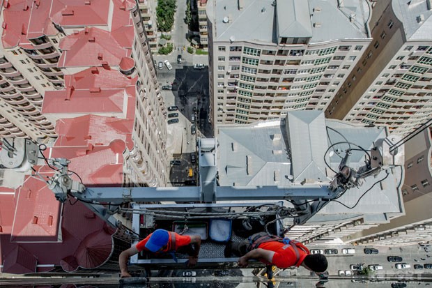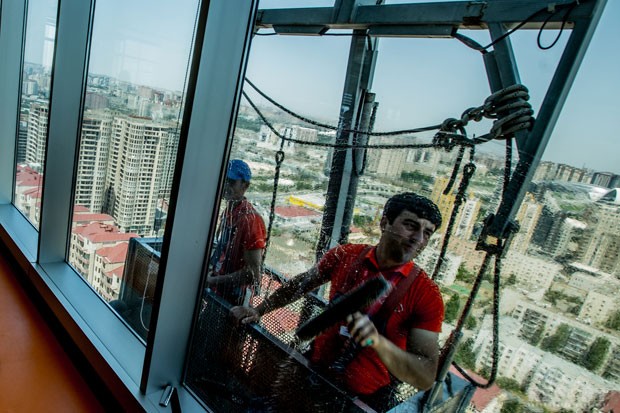 Bakı küləklər şəhəri olduğundan yayın ən isti günündə belə binanın damında küləklə qarşılaşdıq. Müsahiblərim deyir ki, hündür binaların şüşələrinin təmizlənməsi zamanı əsas çətinlik də elə küləklə bağlıdır.